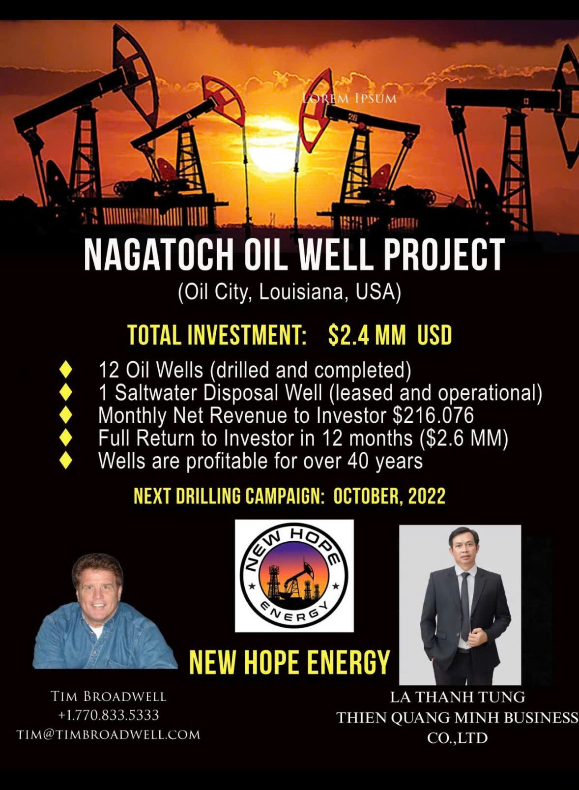 Công ty TNHH Kinh Doanh Thiên Quang Minh vừa chính thức tham dự vào Dự án khai thác dầu khí Nagatoch Oil Well Project tại Oil City, Louisiana, Hoa Kỳ. Đây là một trong những dự án năng lượng quốc tế quan trọng, mở ra cơ hội hợp tác bền vững giữa Thiên Quang Minh và các đối tác toàn cầu trong lĩnh vực dầu khí.